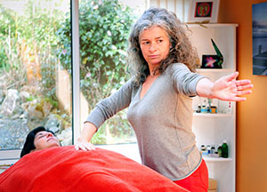 Brigitte Dauphas effectue une série de mouvements gracieux semblables à ceux du Tai Chi. Le patient habillé et relaxé est allongé sur une table de massage. Une session dure une heure trente environ.